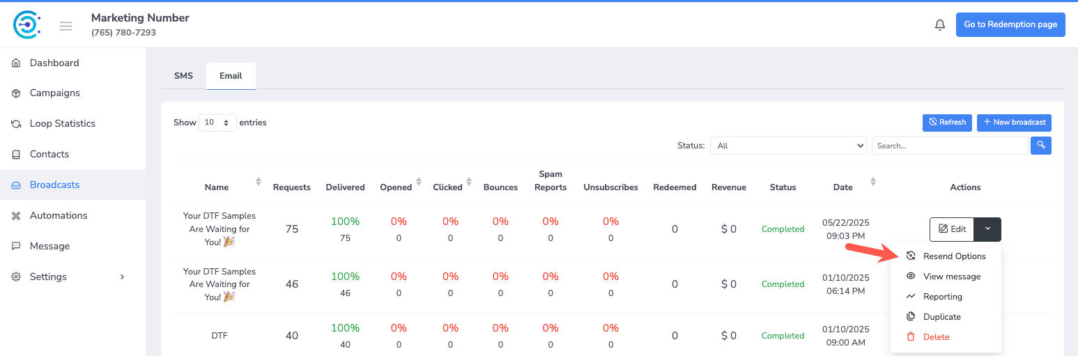 Find the broadcast email you want to resend. Click on the dropdown arrow next to it and select Resend Options.